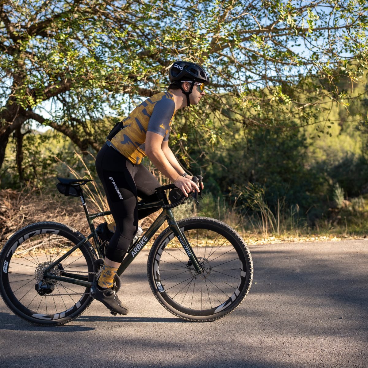 ciclista con equipación Arbike Ambassador Series ascendiendo el Stelvio – prendas de alto rendimiento