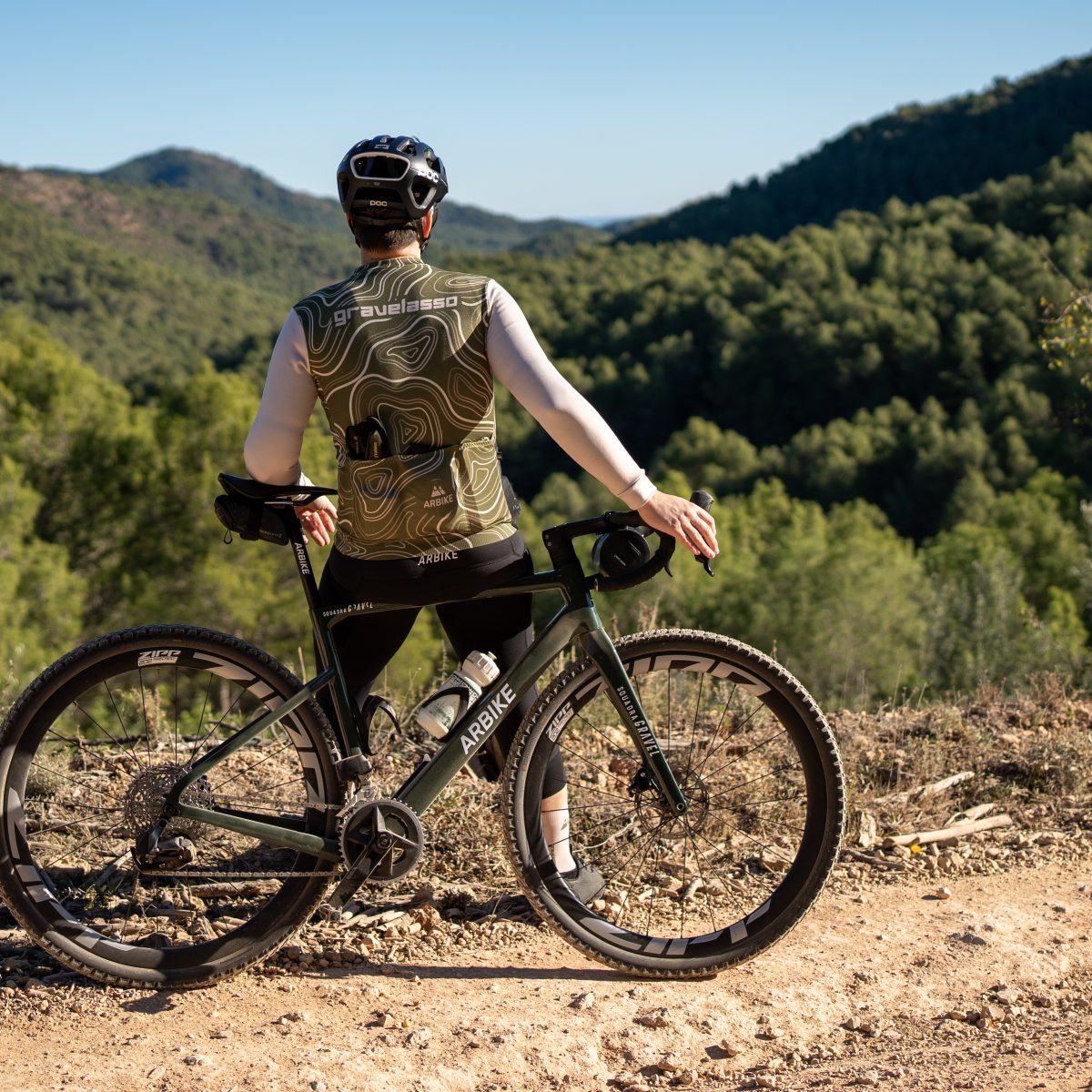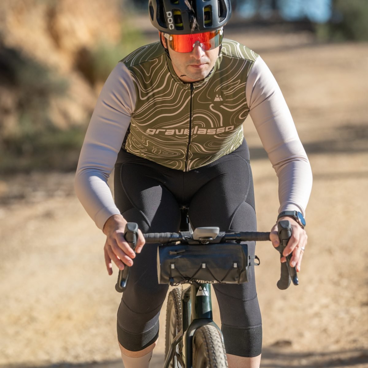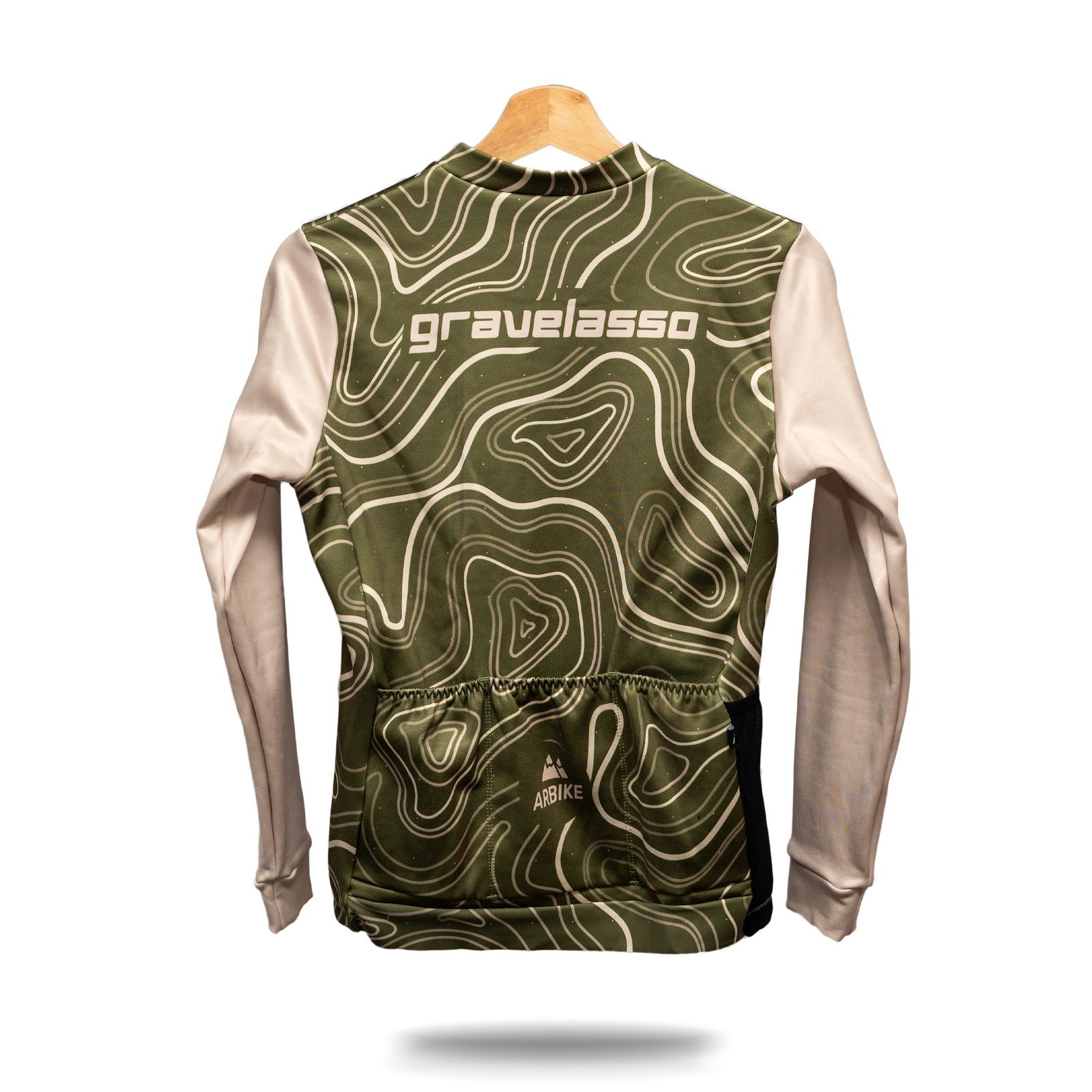 Maillot 100% gravelero para los amantes de los caminos de tierra. En color verde militar con un patrón de lineas beige y mangas del mismo color. ¡Únete al movimiento #Gravelasso!
